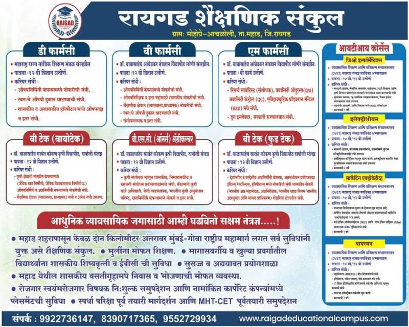 Raigad Educational Campus, Mahad, is a leading educational institution committed to providing quality higher education, practical training, and skill-based learning. Established with the vision of empowering students through knowledge and innovation, the campus has grown into a multi-disciplinary education centre offering diverse professional programmes.