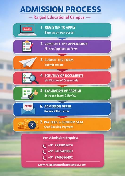 At Raigad Educational Campus, we aim to make the admission process simple, transparent, and student-friendly. Follow the steps below to apply for admission to our various courses in pharmacy, agriculture, biotechnology, food technology, and vocational programs.